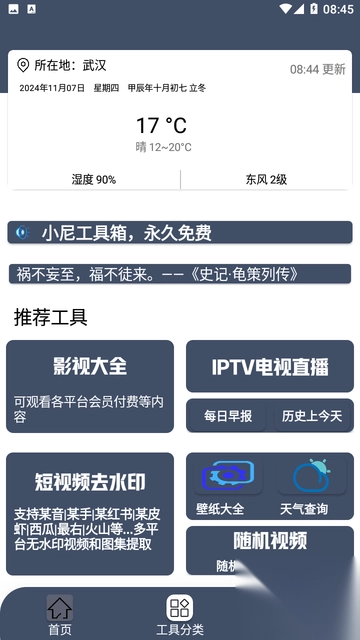 先获取小尼工具箱的安装包并完成安装操作,启动应用后,对弹出的权限申请进行确认,随后即可进入应用的主界面。