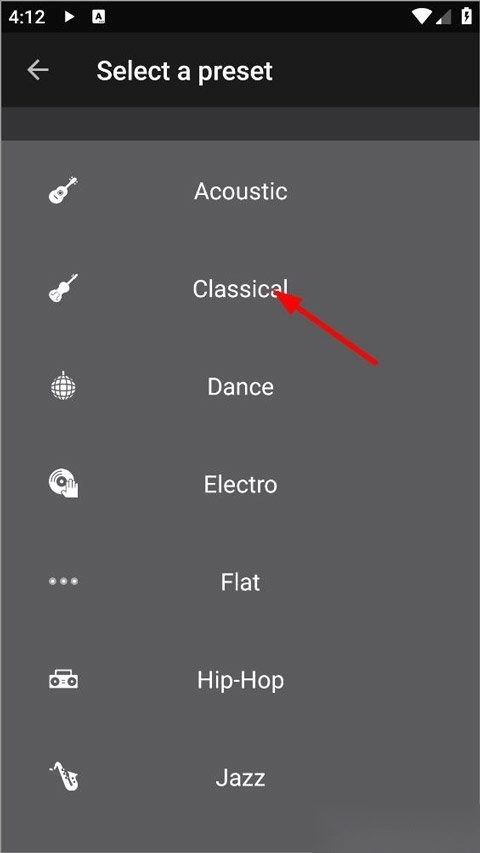 用户启动音乐均衡器应用后,完成登录操作进入主界面,界面上陈列着多种音效选项,用户从中挑选出想要调整的音效进行设置。