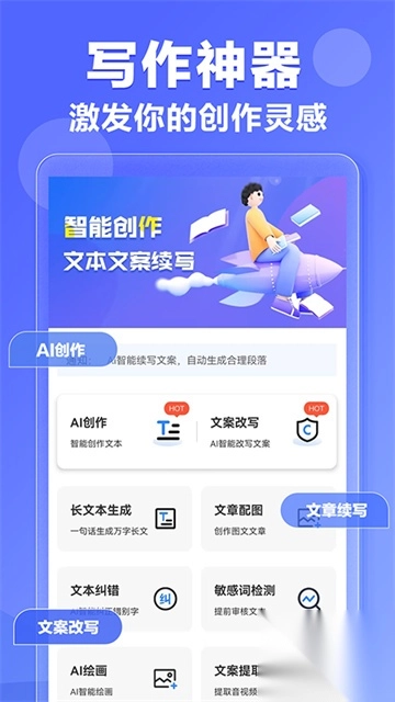 AI写作神器是一款功能强大的智能写作辅助工具,整合了智能写作、灵感激发、文章创作、广告文案撰写等多元服务,助力用户轻松高效地完成各类写作事项。该软件通过模拟人类的写作风格与思维逻辑,为用户提供个性化的写作方案与建议,让用户能够快速产出日报、专刊、月报、工作报告等日常文书,或是创作出富有吸引力的文章与广告文案。