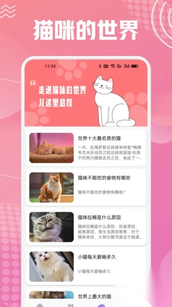 这款名为“开心猫舍喵语”的手机应用,是一个功能丰富的宠物语言翻译工具。它不仅能快速识别并翻译猫咪和狗狗的叫声,将宠物的声音转化为易懂的中文内容,还整合了海量宠物相关知识,涵盖喂养技巧、健康护理等实用信息,全方位满足养宠人士的需求。