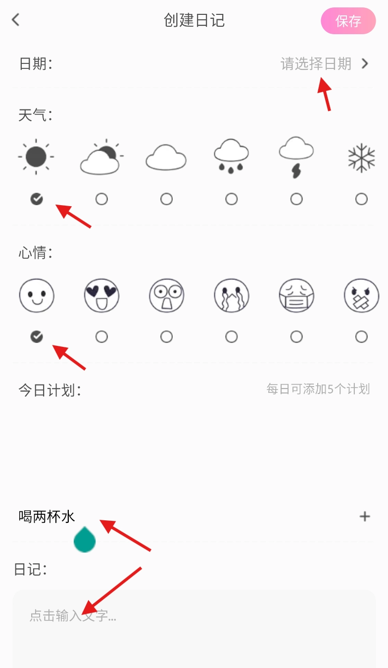 可以跳转到笔记编辑页面,在这里填写日期、天气、心情、计划、日记等相关内容。
