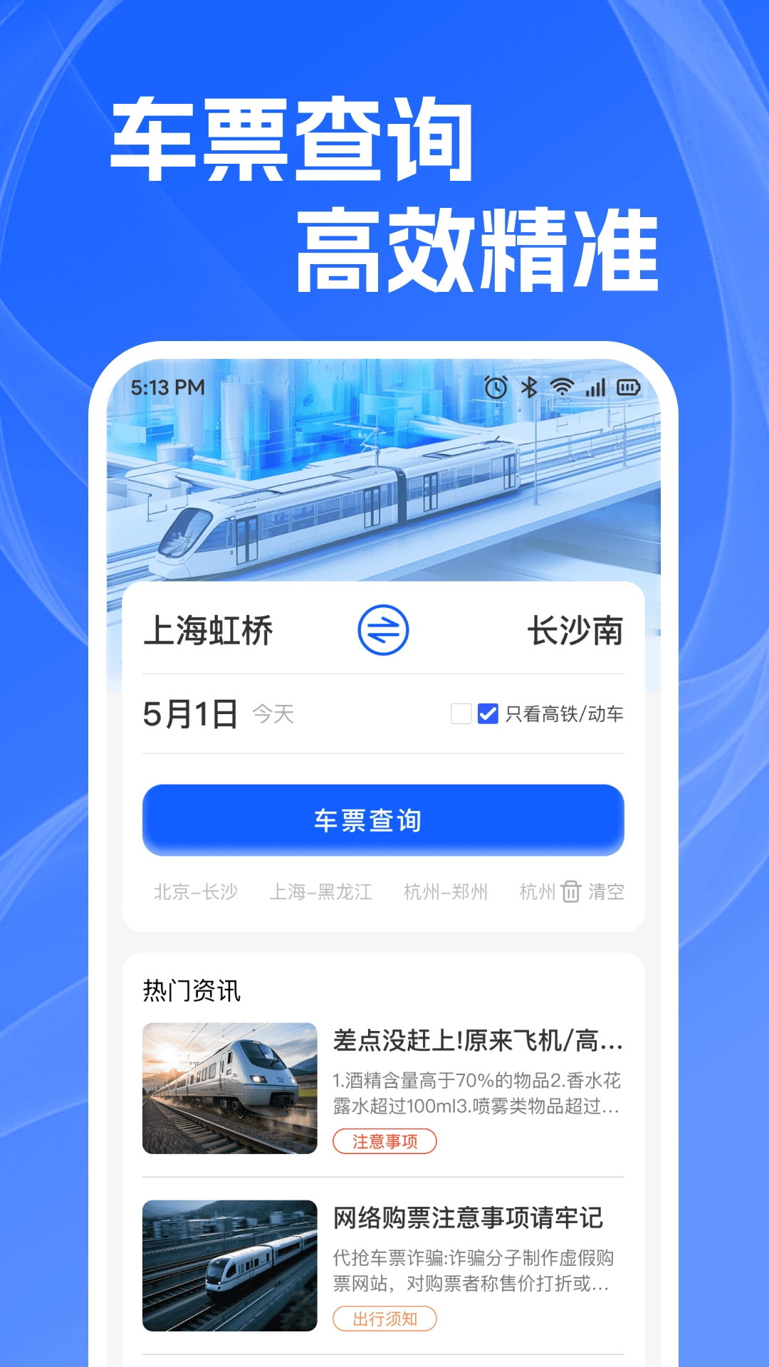 火车高铁查余票是一款能帮助用户快速查询各类火车票信息的手机应用,它能让车票查询变得更高效、精准,还会记录所有行程,方便用户安心出行,各类火车票的最新资讯也能一键浏览。