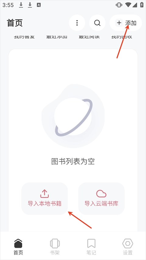 导入书籍的操作方式有两种:一种是点击界面右上角的添加按钮;另一种是首次使用时,首页中间位置会自动显示导入本地书籍的按钮,直接点击该按钮就能完成操作。