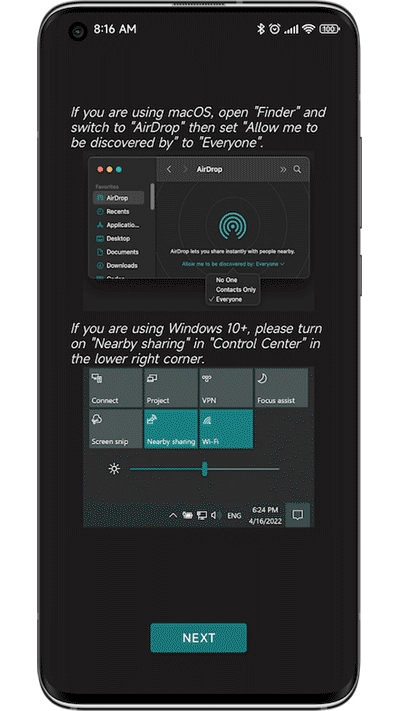 如果您使用的是Windows 10及以上版本的系统,需要连接时,请在右下角的控制中心里开启就近共享功能。
