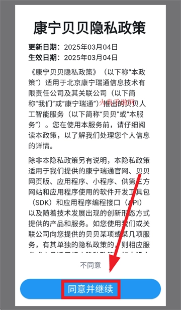 在康宁贝贝隐私政策提示界面点击同意并继续