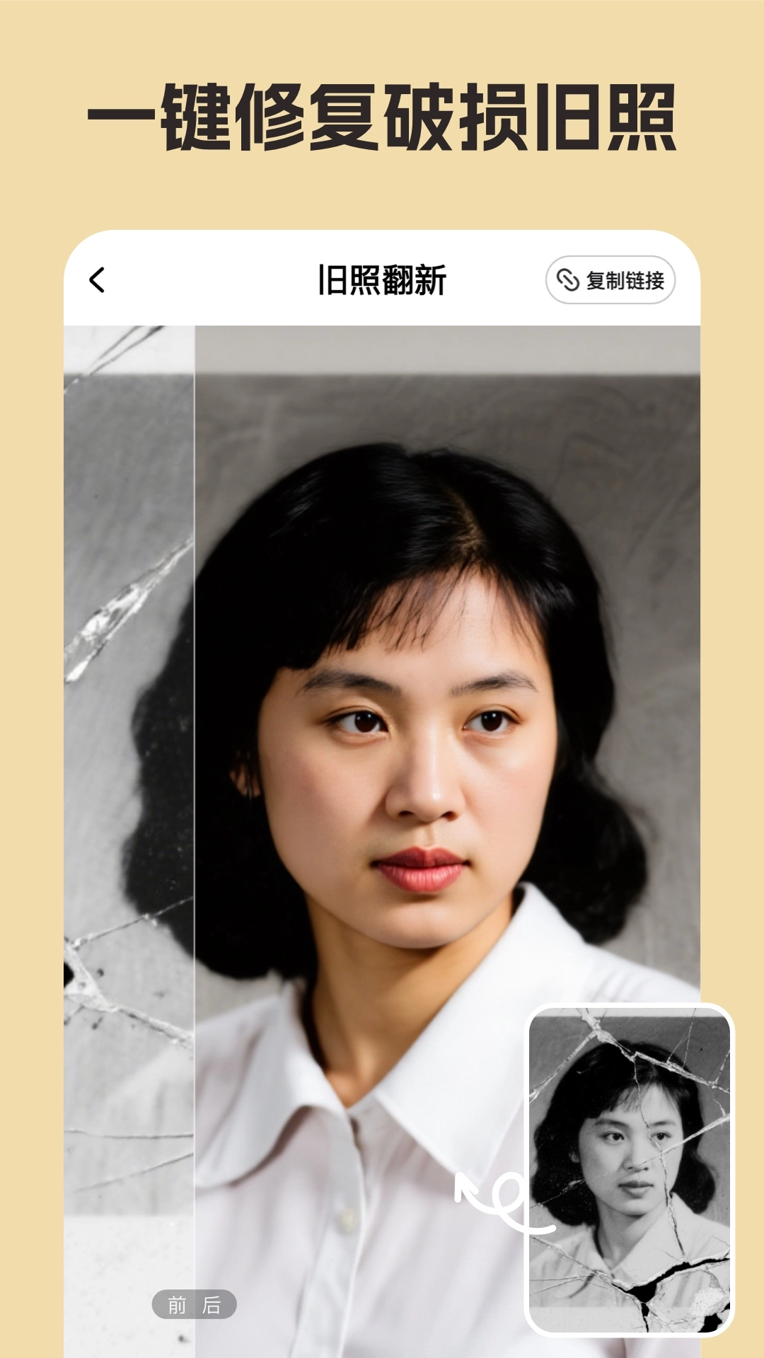 你我当年照片修复软件专注于为用户提供更专业的图片修复服务,只需一键操作,就能轻松完成照片的修复与增强。软件丰富多样的功能,助力用户便捷实现照片一键修复,同时支持多种服务类型,可轻松满足用户在照片修复方面的各类需求。
