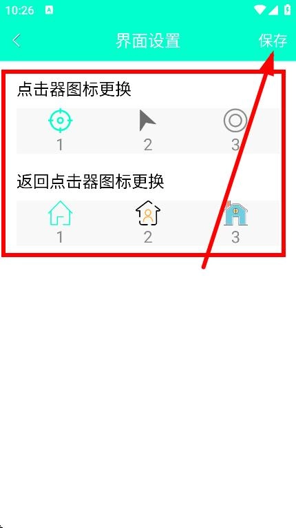 进入界面配置界面后,找到点击器图标与返回点击器图标这两个选项进行选择,最后点击保存按钮完成设置。
