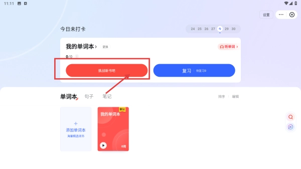 在单词本页,点击挑战单词,参与单词学习挑战。