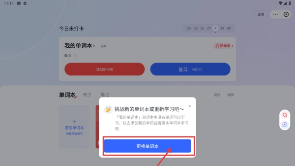 要是想更换学习内容,点击“更换单词本”,挑选新的单词本就能继续学习啦。