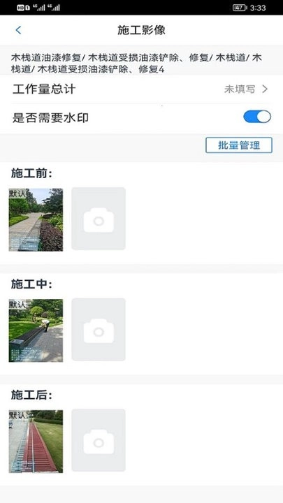 施工人员进行施工影像采集时,无需在每张照片中手动填写施工内容的文字信息,只需直接拍照即可。软件配备的水印相机功能会自动添加施工内容相关信息,还能实时共享施工现场影像。软件后台会自动完成照片整理工作,省去了人工比对整理的繁琐流程,大幅节省工作成本,并且可根据需求导出符合规范模板的影像附件清单。