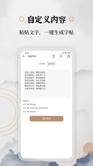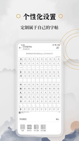 支持用户输入各类文字内容,像古诗、名言、个人随笔等,系统会据此生成对应字体的练习稿;用户也能挑选软件的经典书法素材进行练习。这样既满足了个性化练字的需求,又能让练习过程更具趣味性。