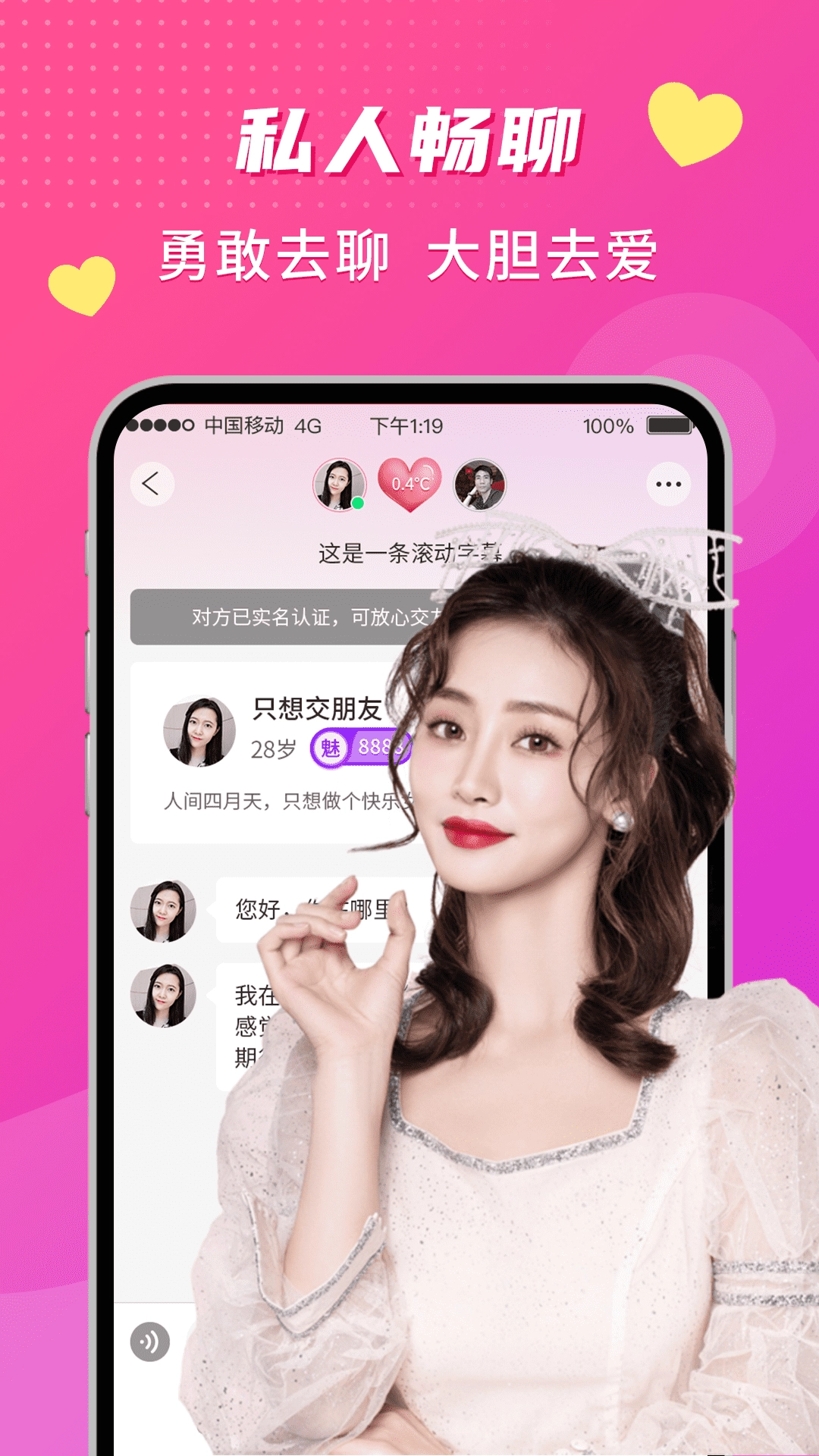 来聊正版是一款相当不错的脱单交友应用,平台上汇聚了来自全国各地的众多帅哥美女用户。在这里,每位用户都有机会邂逅能聊到一块儿的对象。大家可以多在个人社交账号里分享有趣的日常或照片,积极参与社区互动,这样才能让更多人注意到你。感兴趣的用户不妨来试试吧。
