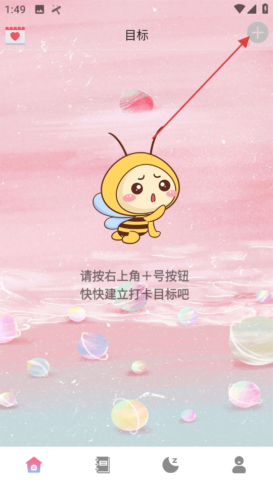 右上角的加号按钮是创建新目标的入口,点击后即可着手设定个人打卡计划;页面中央的蜜蜂卡通形象增添了趣味性;底部导航栏则方便用户快速切换不同功能模块。