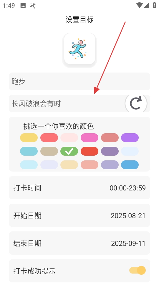 用户能够自定义目标名称与激励语,也可以挑选心仪的颜色来让打卡卡片更具个性,时间日期的设置十分灵活,打卡提醒开关可帮助用户避免遗漏每日任务。
