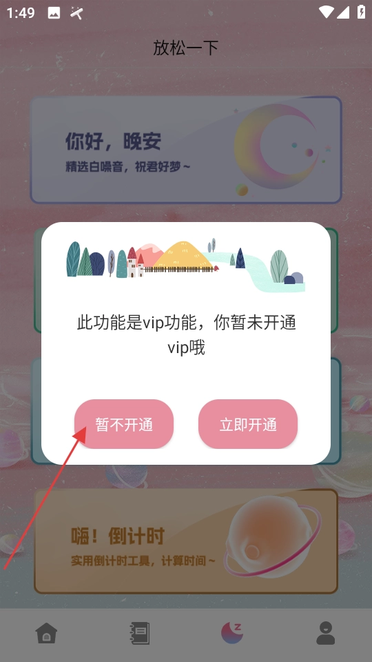 界面中央的弹窗明确提示该功能需开通VIP方可使用,两个操作按钮为用户提供了充分的选择空间,下方还陈列着其他可用功能,例如实用的倒计时工具。