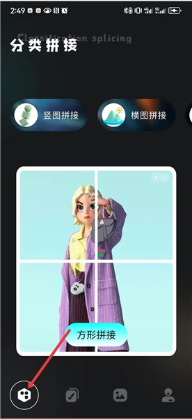 打开应用进入主界面后,能看到分类拼接板块,这里提供竖图拼接、横图拼接、方形拼接等多种拼接方式;点击界面左下角那个类似骰子的图标,就能进入图片编辑功能模块了。