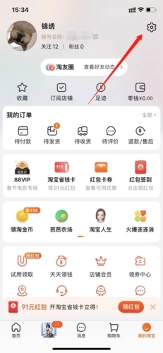 在个人淘宝界面中,点击右上方的齿轮按钮进入设置;