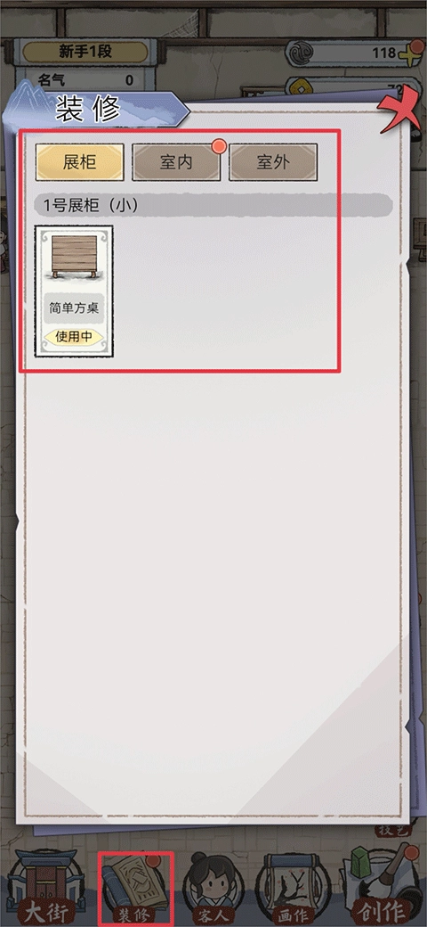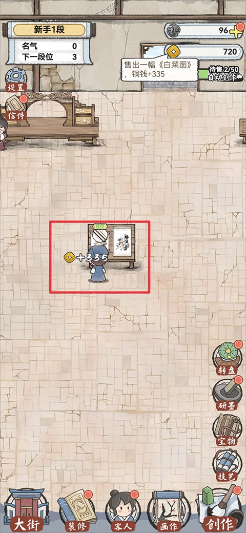 画作装裱好就能拿去卖了,卖的时候得用桌子来摆放画作,你可以点击下方菜单栏里的装修选项购买桌子。