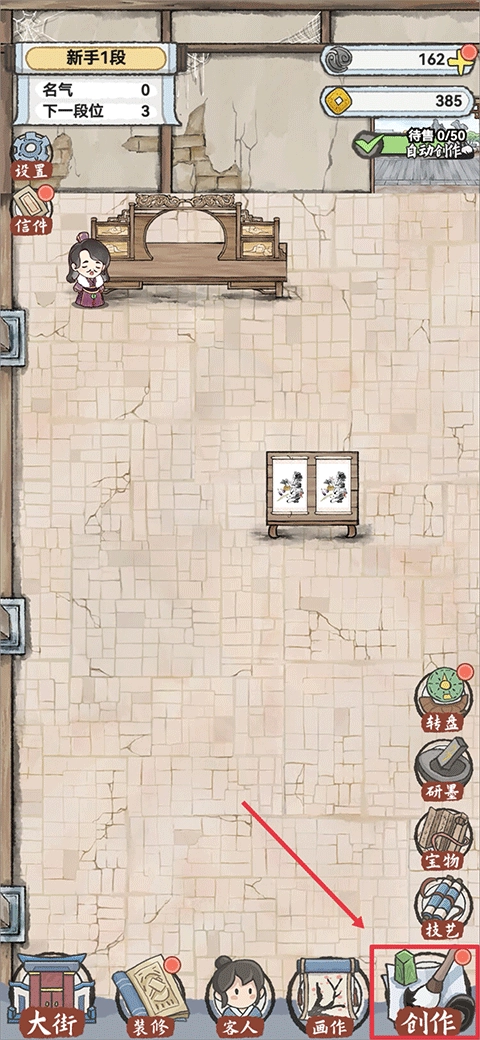 双击打开水墨记游戏后,你需要经营一家画室,而经营画室的第一步就是创作画作,点击右下角的“创作画作”按钮即可开始。