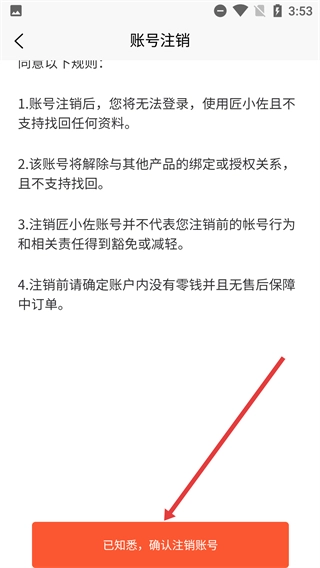 在账号注销页面,认真阅读注销规则后,点击橙色的【已知悉,确认注销账号】按钮,即可进入验证环节。