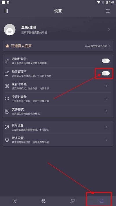若想启用“语音聊天变声模式”,大家可点击右下角按钮进入设置页面,开启“悬浮窗变声”功能即可。