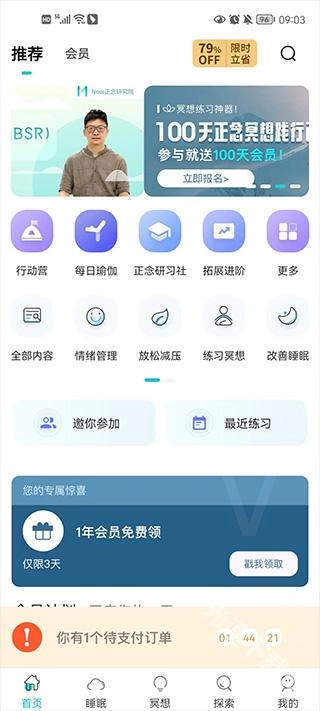 现在是一款中文冥想应用程序,用户通过在该应用中完成冥想课程,能够有效增强记忆力,提升睡眠质量,并减轻压力。