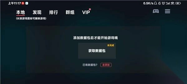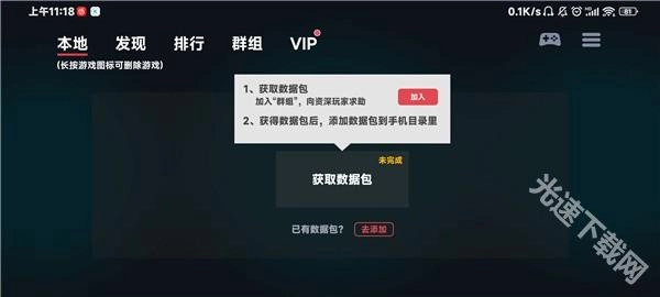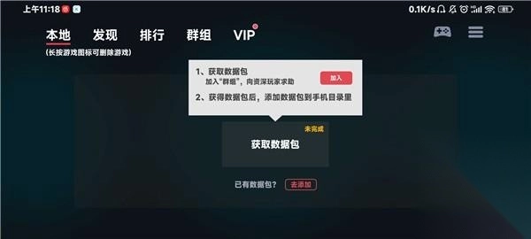 点击获取数据包,加入群组后向资深玩家求助,获得数据包后再添加。