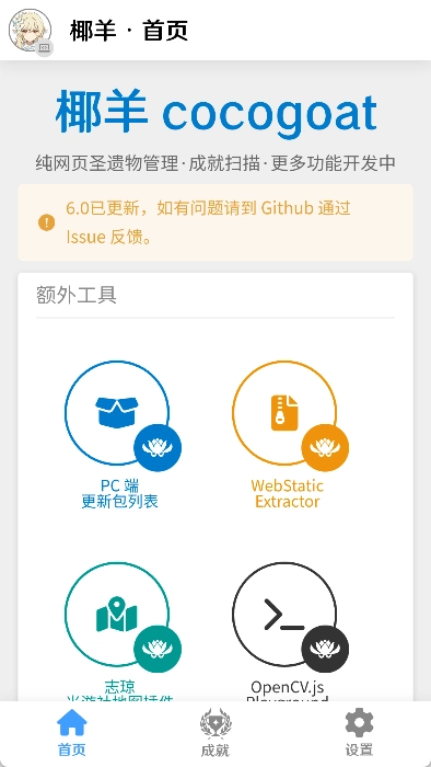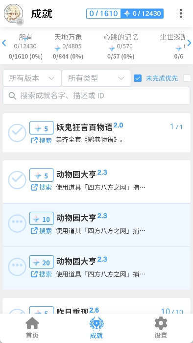椰羊cocogoat是专为原神玩家开发的游戏成就管理工具,能帮我们清楚掌握各类成就的达成方法。它覆盖的游戏版本十分齐全,从最初的1.0版本到最新的6.0版本,相关内容在软件里都能找到。为了让我们更顺利地完成成就,椰羊cocogoat还详细说明了每项成就的完成步骤,助力我们快速达成目标并领取原石奖励。另外,完成成就后,我们可以回到软件中标记已完成状态,避免重复做同一成就的情况发生。