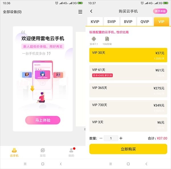 接下来注册并登录账号,然后在云手机里获取设备(当前建议选择Qvip、Svip);