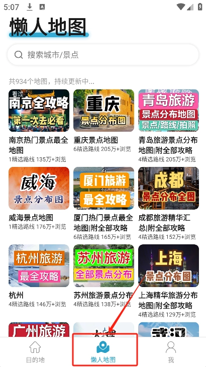 在“懒人地图”板块下,目前已有近800张覆盖全国各地的地图,并且还在持续更新。用户能够直接搜索地名来查看相关地图攻略,其中涵盖了国内外的旅游城市。