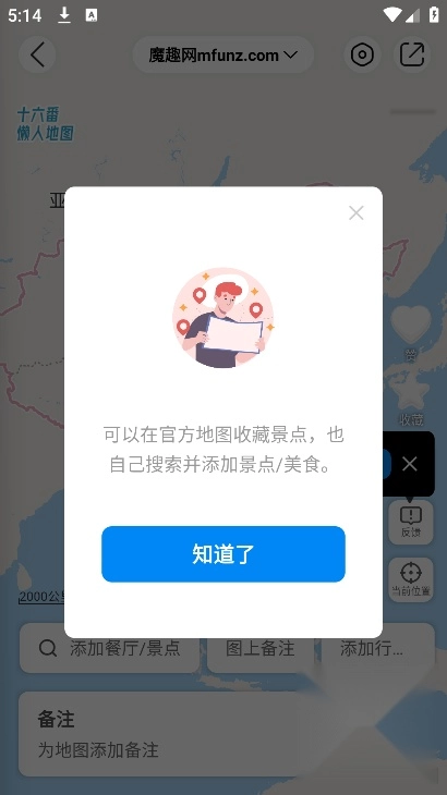 若需使用完整地图功能,需先开启定位权限,之后可根据自身需求添加餐厅或景点,还能为地图添加备注信息。