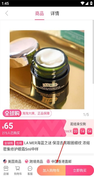 进入海蓝之谜眼霜的商品详情页,查看其价格与商品信息,了解购买情况后,继续浏览商品相关内容。