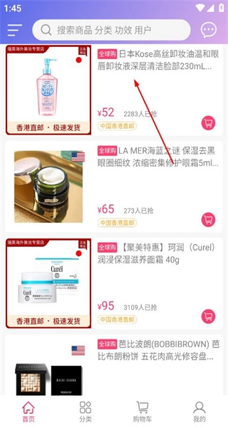 打开软件后,首页陈列着多款美妆商品,从中挑选日本高丝卸妆液,随后进入该商品的详情页面。