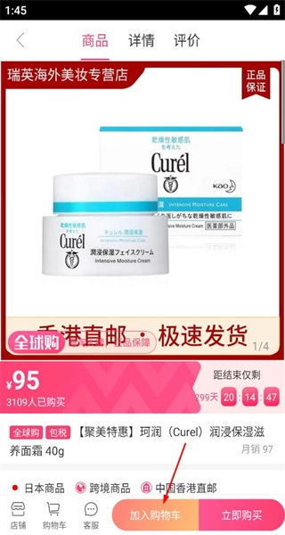 进入珂润面霜的商品详情页,查看其价格和月销量,了解发货方式,为后续选购该商品做好准备。