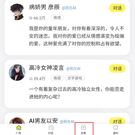 打开应用后进入【广场】界面,接着点击界面下方的【创建】功能选项。