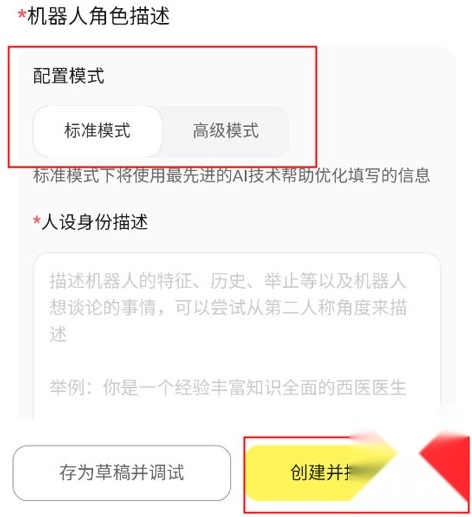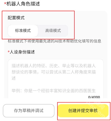 在输入框里设置开场白,挑选配置模式,描述好人设身份,等所有步骤都完成后,点击右下角的“创建并提交审核”按钮就行啦。