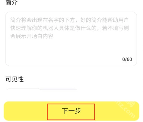 输入机器人的名称和简介,勾选可见性,进入下一步。