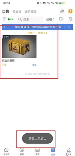 上架成功后,我们可以在出售界面可看到物品。