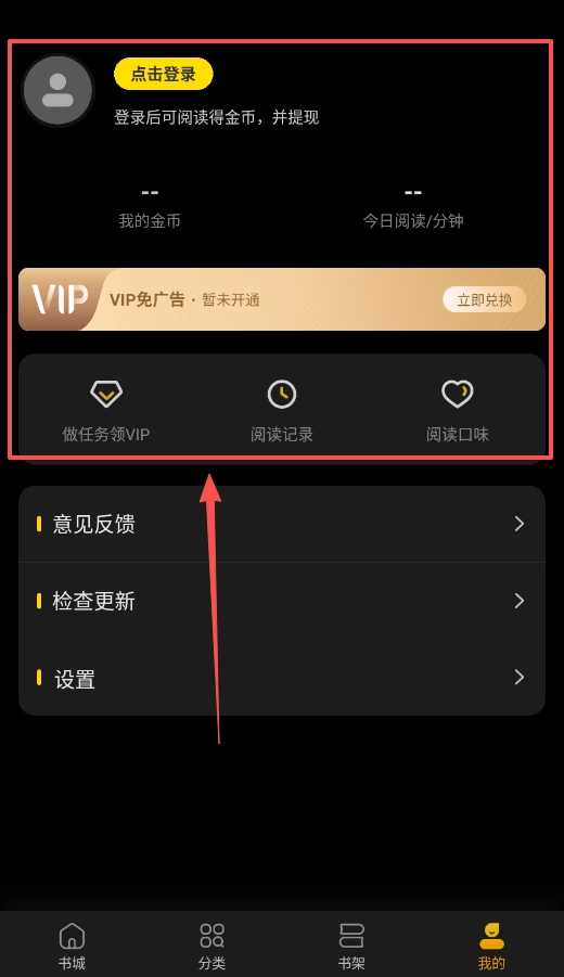 要解锁完整的使用体验,首先需要点击底部的“我的”标签页完成登录操作。登录之后,你还能在这个页面里管理自己的VIP状态、查看阅读相关的数据,以及进行个性化的设置调整。