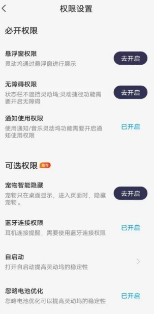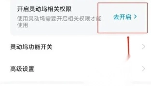 在“灵动坞”界面找到“开启灵动坞相关权限”选项,点击该选项进入权限设置页面进行相关权限的配置。