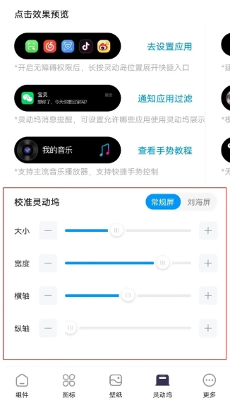 完成设置后回到“灵动坞”界面,依据预览效果来调整灵动岛的位置和大小,使其在屏幕上呈现出舒适且合适的状态。