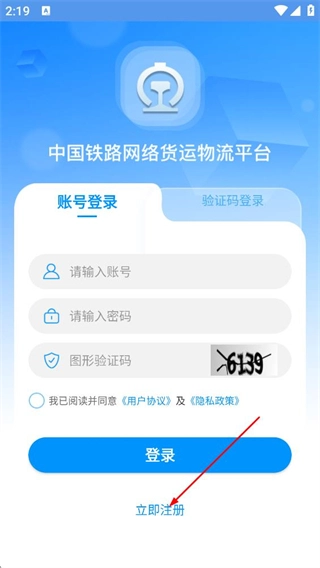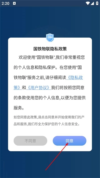 在国铁物联的隐私政策弹窗里,点击同意按钮后,即可进入账号登录页面。
