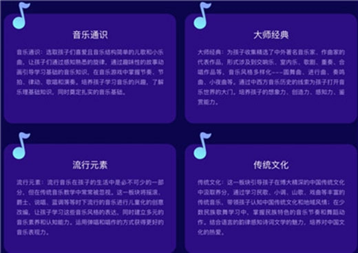 整合了儿童音乐培养领域的优势资源,是一个专注于提升儿童综合音乐素养的智能教学平台。
