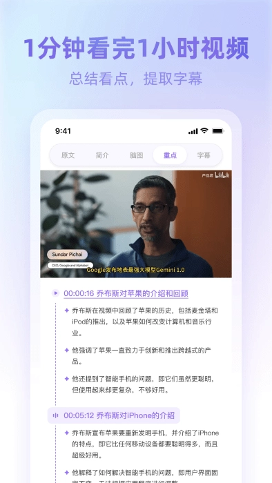 快速提炼核心要点,抓取内容精髓,1小时的视频,1分钟就能让你快速领会。支持提取字幕,还能定位视频具体位置,查找精彩片段变得简单轻松。