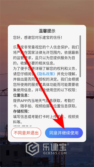 1、启动乐建宝应用,当出现温馨提示弹窗时,点击“同意并继续使用”按钮。