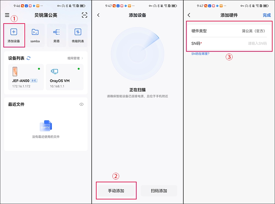 查询蒲公英硬件的SN码,手动输入绑定硬件。