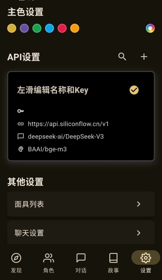 5、进入设置菜单里的面具列表,可自行添加自定义角色,勾选对应的自定义角色后,就能用该角色与AI进行聊天互动了。