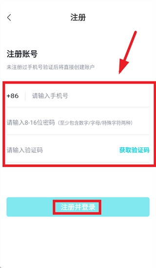在注册页面填写手机号、密码和验证码,接着点击注册并登录按钮就能完成操作。