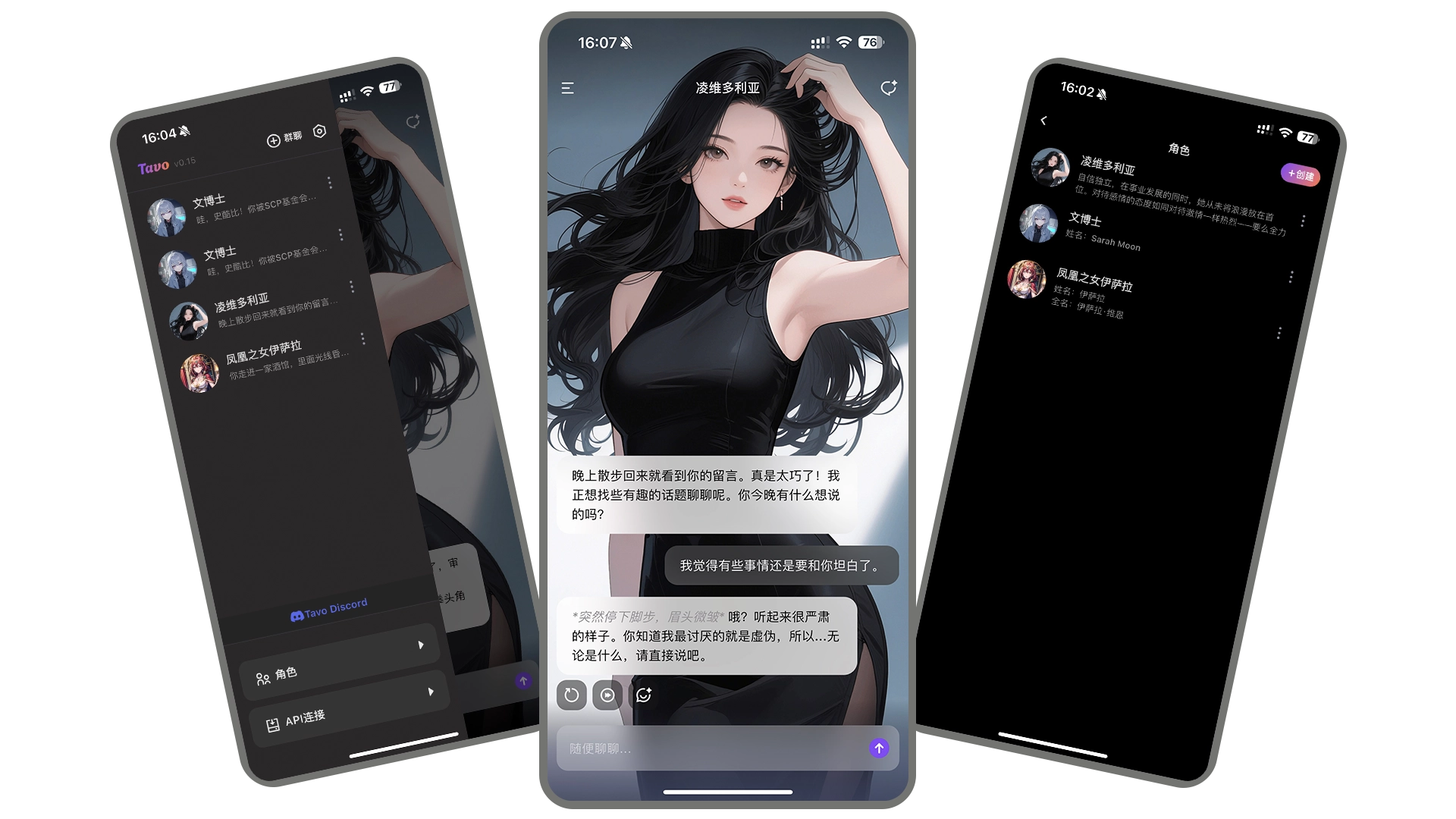 1、Tavo安卓版是专门为AI角色扮演打造的应用,既可以从零开始创建角色,也能导入酒馆角色卡,并且和各大热门角色卡网站都能兼容。