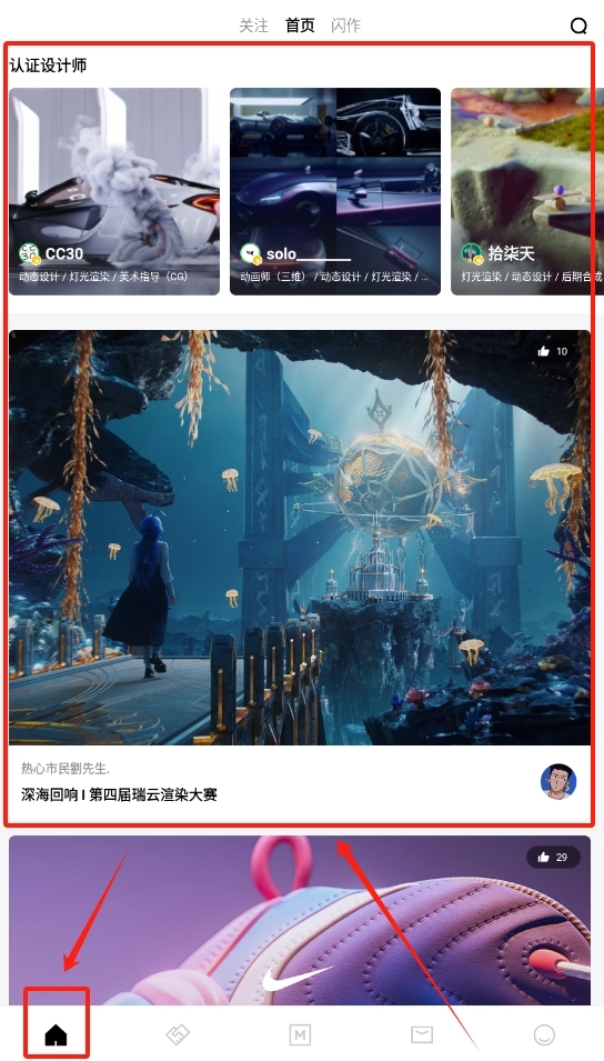 1、打开后直接进入首页界面,在页面中间醒目的位置找到设计师分类的入口,点击该入口即可进入作品浏览页面。